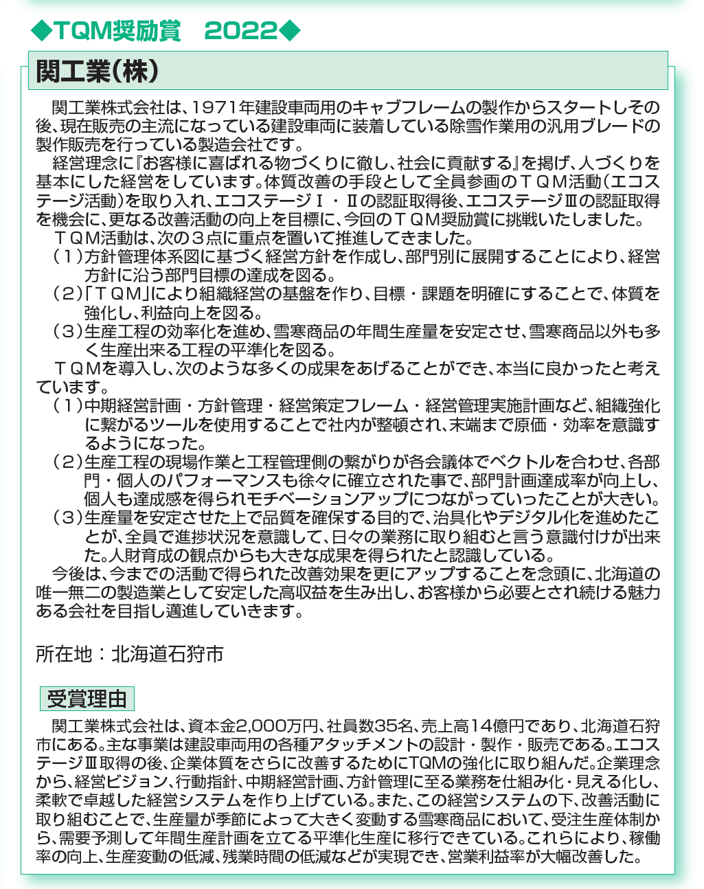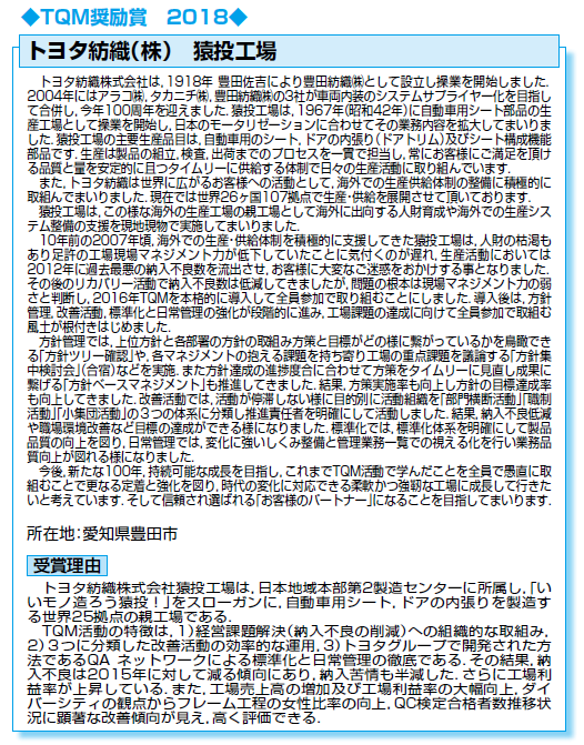 以上の活動内容およびその成果から「日本品質奨励賞・TQM奨励賞」の授賞を決定した。