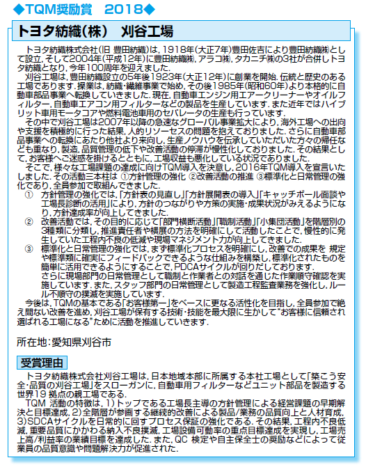 2001 年に「日本品質奨励賞 TQM 奨励賞」の受賞際、活動の重 点とした、方針管理、現場運営管理ならびに小集団活動の仕組みは 現在もわが社にいかされ、「PDCA を回す」ことで企業体質の強 化が図れ、プロセス重視の業務が活かされております。