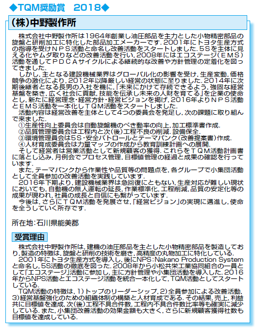 受賞企業の株式会社マルヤスエンジニアリングは1994年にマルヤス工業(株)から分離独立し名古屋市に設立された製造設備の総合メーカーで、2014年度売上高約42億円、従業員67名規模の会社である。2012年までの業績が伸び悩み状態であったことから、2013年に「顧客指向で環境の変化に対応できる企業体質への変革」を目的としてTQMを導入した。