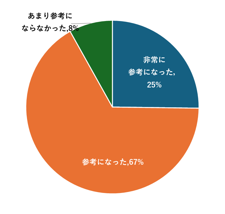 アンケートに回答いただいた9割以上の方々から「非常に参考になった」「参考になった」と回答いただき、「受動的ではなく、自律的に考えるリスクアセスメントが製品安全に本質的につながると理解できた」「リスクアセスメントの基本理解・再整理ができた」「向殿先生の製品安全への想いが詰まった、非常に価値のある講演だった」といった多くのコメントをいただきました。